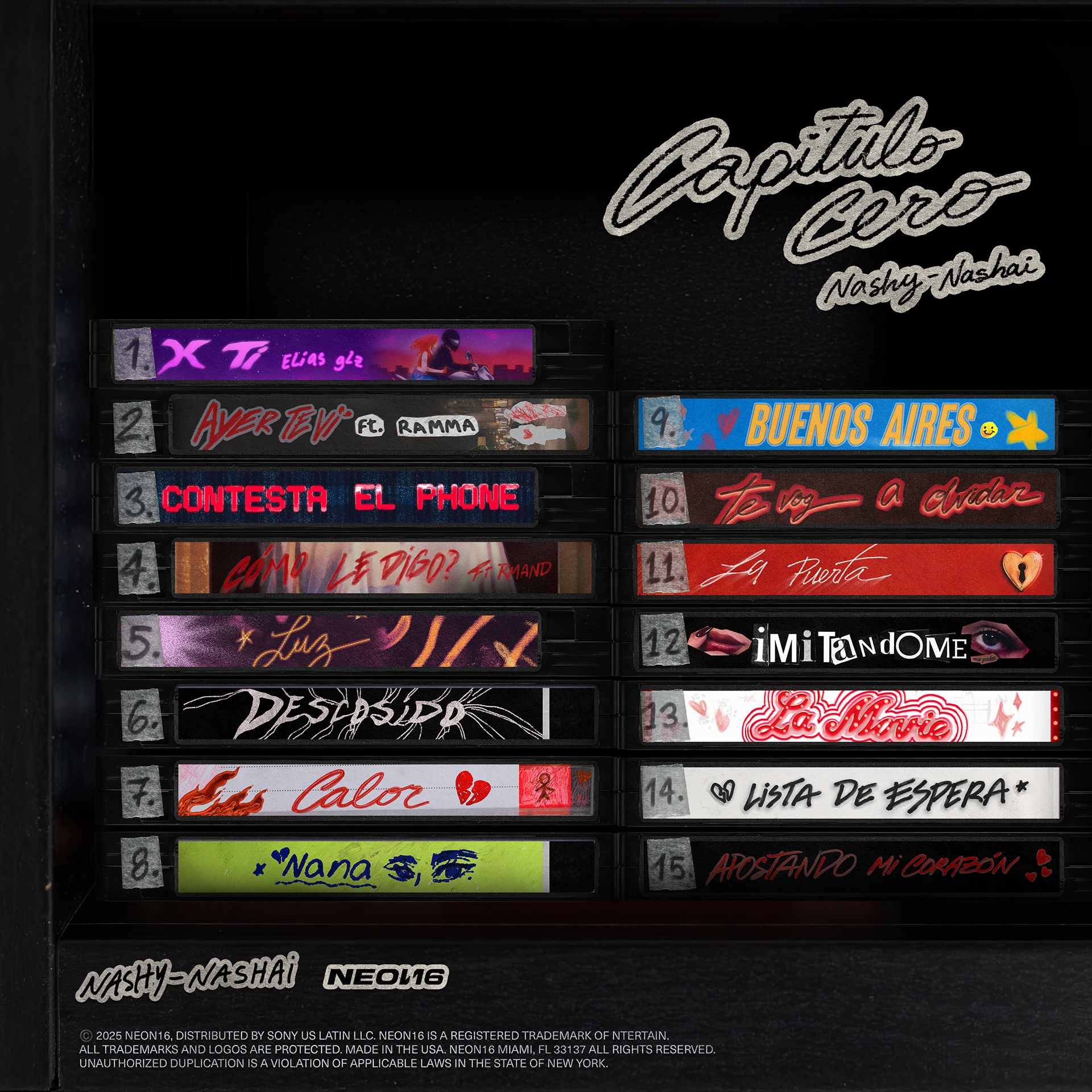 For this project, I developed the visual identity for Nashy’s CAPÍTULO CERO, including the album cover, tracklist, and single covers. The visuals balance bold energy with a strong pop presence, setting the tone for this new era while staying true to Nashy’s essence. The concept is built around the idea that each song represents a cassette, a cinematic moment, a movie from her life.